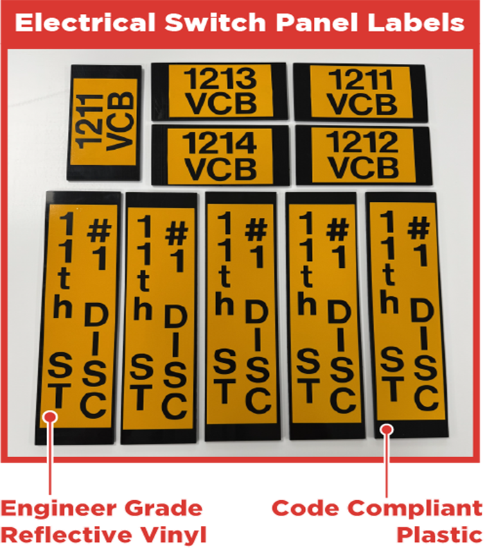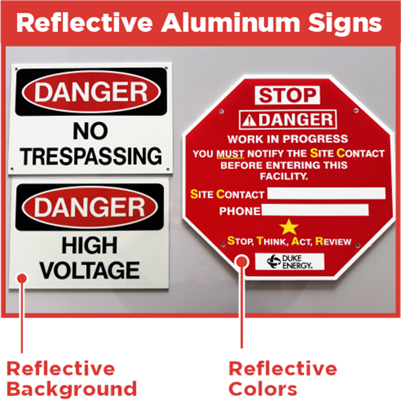 High-visibility reflective signs for infrastructure, poles, enclosures, and hazard areas.